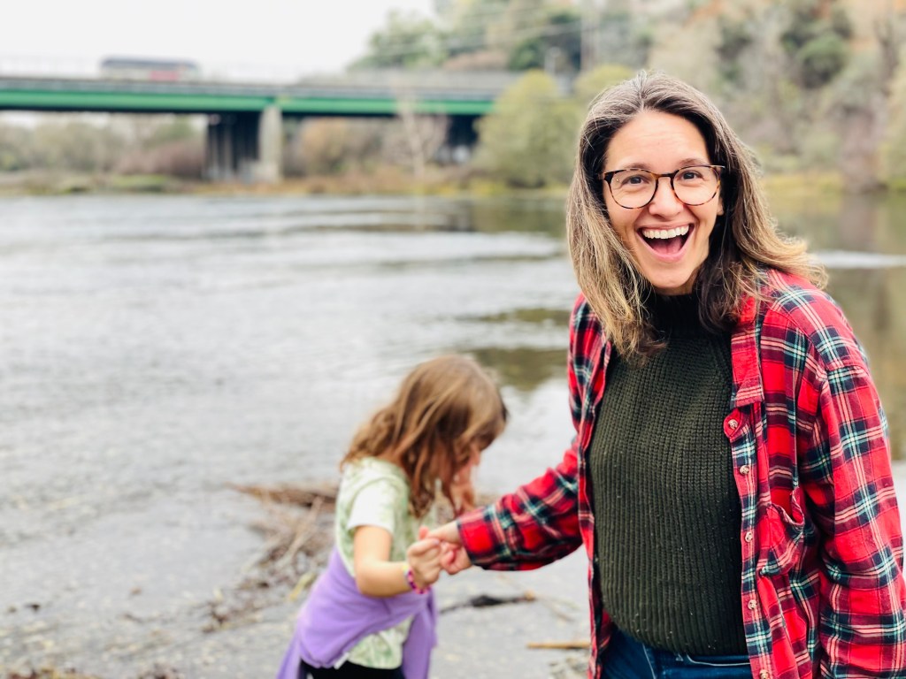 Alison is pictured here with her daughter, having just witnessed a salmon leap from the American River.